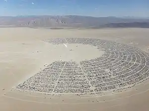 Black Rock City, Nevada is an ephemeral town that exists for only one week each year, during Burning Man, a radical arts festival. At its maximum occupancy, the town has about 60,000 citizens and a post office, an emergency services crew, a volunteer police department, roads, houses, bars, clubs, restaurants, and hundreds of art installations and participatory "theme camps". After a week, the city is completely disassembled – much of it burned – leaving the stark, white desert exactly as bare as it had been when the event started.