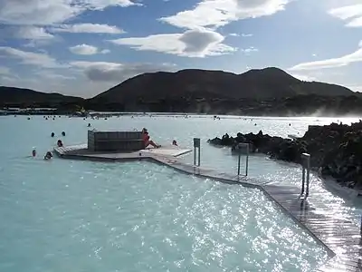 Blue Lagoon (Icelandic: Bláa Lónið) (BLAU-ah LONE-eeth) is a geothermal spa in southwest Iceland, that is almost mid-way between Keflavik Airport and Reykjavík, close to the town of Grindavik. Entry is expensive, starting at 9,990 kr per person for the basic package at off-peak time slots (April 2023) and rises rapidly from there. This is a very popular tourist destination, attended by over 80% of tourists (around 1.3 million in 2017).