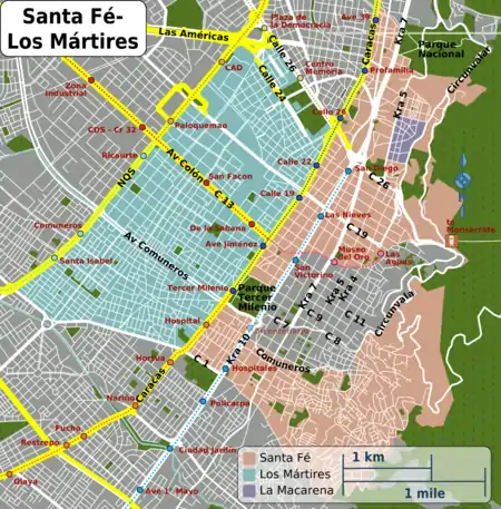 Santa Fé is the traditional downtown of Bogotá, surrounding the historic district of La Candelaria. Los Mártires is the western end of downtown (west of Kra 10/Caracas), and more rarely visited by foreigners, except to check out its sketchy market for extremely good deals.
