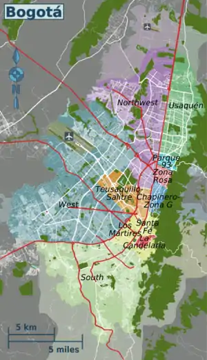 | Chapinero-Zona G Chapinero is one of the most expensive and elegant districts in the city. It features high-rise residential buildings, historic mansions, extensive parks, financial centers, and the largest dining district in Bogota. Chapinero is also where the majority of foreign embassies are located. |