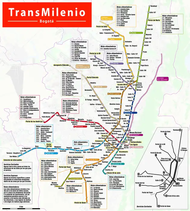The sheer number of bus numbers is quite intimidating, but has a simple logic to it. There are actually only ten routes, demarcated by letters (and names, but don't worry about that). J and L routes will take you into the historic/political center, with J buses even stopping right at the Gold Museum. B buses will take you up through the North, with Calle 85 being the closest stop to the popular Zona Rosa, B buses take you to Portal del Norte, where you can catch inter-city buses up to Zipaquirá (for the Salt Cathedral). K buses head out towards the airport.