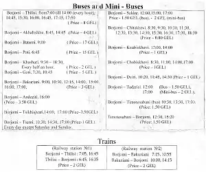 - There are several direct bus connections to other places in Georgia, like Tbilisi, Kutaisi, and even Batumi. The timetable in the image gives an overview. The prices can be different while the departure times are quite stable even for years (according to the Marshrutka drivers).