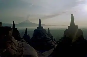 Borobudur was heavily affected by the eruption of Mount Merapi in October and November 2010. Volcanic ash from Merapi fell on the temple complex, which is approximately 28 km (17.5 mi) west-southwest of the crater. During the strong eruption of 3–5 November for example, a layer of ash up to 2.5 cm (1 in) thick fell onto the temple. This also killed nearby vegetation. Experts feared that the acidic ash might severely damage the historic site.