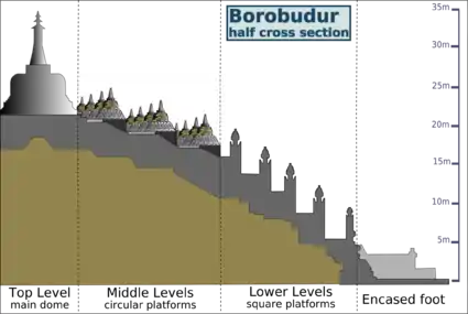 The monument's three divisions (the square terraces and central stupa at the peak are regarded as one division) symbolise the three realms of Buddhist cosmology, namely Kamadhatu (the world of desires), Rupadhatu (the world of forms) and Arupadhatu (the formless world).