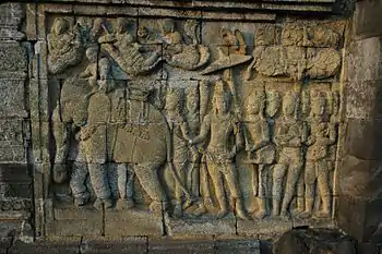 - The law of karma or Karmavibhangga. These are mostly hidden by the post-original construction masking at the foot of the monument. The reliefs tell stories and give examples of the nature of karma with depictions of both praiseworthy (including co-operative working practices and planned parenthood) and blameworthy (including torture, rape and theft) activities. The masking was disassembled in 1890 before being painstakingly rebuilt, and photographs were taken of the reliefs at this time. These photographs are displayed in the Borobudur Museum.