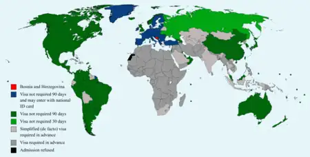 Passport holders of the following countries do not need a visa to enter Bosnia and Herzegovina when the purpose of the visit is tourism for up to 90 days (unless otherwise noted): Albania, Antigua and Barbuda, Andorra, Argentina, Australia, Austria, Azerbaijan, Bahamas, Bahrain, Barbados, Belgium, Brazil, Brunei, Bulgaria, Canada, Chile, Colombia, Costa Rica, Croatia, Cyprus, Czech Republic, Denmark, Dominica, El Salvador, Estonia, Finland, France, Georgia, Germany, Greece, Grenada, Guatemala, Holy See, Hong Kong, Hungary, Iceland, Ireland, Israel, Italy, Japan, Kiribati, Kuwait, Latvia, Liechtenstein, Lithuania, Luxembourg, Macau, Malaysia, Malta, Marshall Islands, Mauritius, Mexico, Micronesia, Moldova, Monaco, Montenegro, Netherlands, New Zealand, Nicaragua, North Macedonia, Norway, Oman, Palau, Panama, Paraguay, Peru, Poland, Portugal, Qatar, Romania, Russia (30 days), Saint Kitts and Nevis, Saint Lucia, Saint Vincent and the Grenadines, Samoa, San Marino, Serbia, Seychelles, Singapore, Slovakia, Slovenia, Solomon Islands, South Korea, Spain, Sweden, Switzerland, Taiwan, Timor-Leste, Trinidad and Tobago, Turkey, Tuvalu, Ukraine (30 days), United Arab Emirates, United Kingdom, United States, Uruguay, Vanuatu and Venezuela.