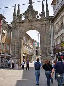 - 🌍 Arco da Porta Nova. An arch of triumph built in 1502 and reconstructed many times over until the 18th century. It proves less than monumental, being nestled between buildings, nevertheless providing for a beautiful photo setting with its rococo decorations. The figure atop the arch is the allegorical representation of the city of Braga, and the city has used the arch's image in many of its marketing and social campaigns.