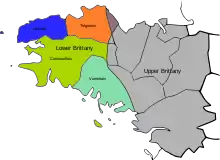 | Upper Brittany (Haute-Bretagne) ("Breizh Uhel" in Breton) consists of the eastern part (Ille-et-Vilaine, Loire-Atlantique, eastern Côtes-d'Armor and eastern Morbihan), where the Gallo language is spoken. |