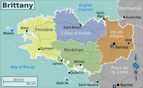 | Lower Brittany (Basse-Bretagne) ("Breizh Izel" in Breton) consists of the western part (Finistère, western Côtes-d'Armor, western Morbihan and the area around Guérande), where the Breton language is spoken. |