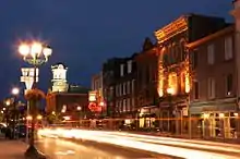 There are two principal commercial districts. The town's main street, King Street (old Ontario Highway 2) is one block from the waterfront and the home of most of the city's established independent merchants. There is also some newer commercial development along the freeway (Parkedale Avenue parallels Highway 401 between exits 696 and 698; the Stewart and Parkedale area includes grocers, big-box/department stores, fast food and chain hotels as well as the 1000 Islands Mall).