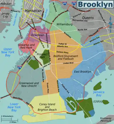 Brooklyn, the "Borough of Homes and Churches," is one of the five boroughs of New York City. It used to be a separate city, and still feels much like one. It has about 2.5 million inhabitants. If separated from the rest of New York City, Brooklyn would be the 4th most populous American city.