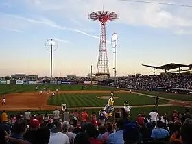 A Cyclones game at MCU Park; the Parachute Jump, one of the most recognizable structures in Coney Island, is in the background