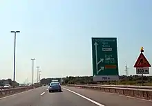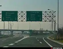At the southern outskirts of Belgrade, at exit 24/28 Bubanj Potok (612 km) the Brotherhood and Unity Highway will join with the beltway mentioned before and continue along the A1. After exit 30 there's a toll plaza again. Two mid-sized cities, not at the road but 10-20 km or so away, can be reached from exits 35 and 36 (658 and 659 km, practically next to each other): 🌍 Smederevo, capital of Medieval Serbia at the Danube, and 🌍 Požarevac , and further away the Roman archaeological site Viminacium.