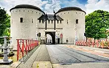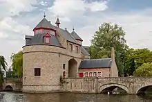 - 🌍 Ezelpoort (Donkey Gate), Ezelstraat. Just like the Smedenpoort, this gate is completely surrounded by water. Nowadays the gate is only used by pedestrians and cyclists. The gate previously also was called the Oostendsche Poort (Ostend Gate) since the road through the gate lead to Ostend.
