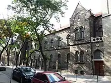 : 'Dózsa György út' or M3: 'Lehel tér'. Close to Taksony St corner), ☏ +36 1 3208207, +36 20 824-4138, angyalfold@lutheran.hu. Worship: Su 10:00. Lutheran Church of the Budapest-Angyalföldi Congregation stay on the Angyalfold Kassák street since 1938. The Second World War brought massive destruction. After the war finished church bell is now the largest Protestant bell on the Pest side. The gray-colored church shows classicist elements. The facade facing toward Kassák street is square-shaped, with little decoration, the entrance is in the middle of it, a small circular window can be see both sides of the gate. Above the entrance is a semi-circular window. The facade crowned by a pediment in the middle of its a circular window and with stone garland decoration . - 🌍 Former Arena synagogue (Aréna úti zsinagóga), XIII. Dózsa György út, 55. (From