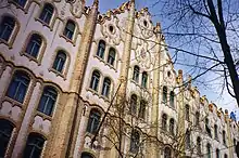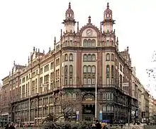 Vörösmarty tér). It is a former bank building. Built between 1909-1913, by Alpár Ignác, in late eclectic Art Nouveau style. A five-story stone covered brick building with Patio.