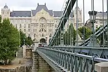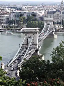- 🌍 Szechenyi Chain Bridge (Széchenyi lánchíd) (V.). Hungarian pronunciation: [ˈseːt͡ʃeːɲi ˈlaːntshiːd]). This is a suspension bridge that spans the River Danube between Buda and Pest, the western and eastern sides of Budapest, the capital of Hungary. Designed by the English engineer William Tierney Clark, it was the first permanent bridge across the Danube in Budapest, and was opened in 1849. (It is a larger scale version of William Tierney Clark's earlier Marlow Bridge, across the River Thames in Marlow, England.) It is also the oldest permanent bridge on the Danube. It is anchored on the Pest side of the river to Széchenyi (formerly Roosevelt) Square, adjacent to the Gresham Palace and the Hungarian Academy of Sciences, and on the Buda side to Adam Clark Square, near the Zero Kilometer Stone and the lower end of the Castle Hill Funicular, leading to Buda Castle. The bridge has the name of István Széchenyi, a major supporter of its construction, attached to it, but is most commonly known as the Chain Bridge. At the time of its construction, it was regarded as one of the modern world's engineering wonders. It has asserted an enormous significance in the country's economic, social and cultural life, much as the Brooklyn Bridge has in New York and United States of America. Its decorations made of cast iron, and its construction, radiating calm dignity and balance, have elevated the Chain Bridge to a high stature in Europe. It became a symbol of advancement, national awakening, and the linkage between East and West. - The bridge was opened in 1849, and thus became the first permanent bridge in the Hungarian capital, after the Hungarian Revolution of 1848. At the time, its center span of 202 m was one of the largest in the world. The lions at each of the abutments were carved in stone in 1852, by the sculptor, János Marschalkó. They are visibly similar in design to the famous bronze lions of Trafalgar Square by Edwin Henry Landseer with Marochetti, installed 1867. They are also smaller (and appear from below to lack tongues). The bridge was given its current name in 1898.