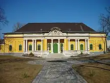 - 🌍 Gizella Mansion (Gizella-kastély), XVI, Egyenes utca 21-23 (Egyenes utcai lakótelep 276E ). Only from outside. This is a hillside mansion with outbuildings. Built circa 1790. The main facade of gardenside (to West) is a storey. The facade facing to yard (to East) has only ground floor. The building has covered with gable roof, the shell of its is plain tile. The Eastern side portico supported by four Tuscan columns. The facade of east is decorated with triangular tympanum which include a coat of arms with G.Z. initials. The builder was Earl János Festetich. There is a farm building with wooden porch and two wings, located on the northern part of the yard. The building had been in ruins for decades. Now inhabited again, is privately owned.