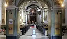- 🌍 Chapel of St Roch (Szent Rókus kápolna), VIII. Rákóczi út 31 (trolley 74 to stop Nagy Diófa utca, bus 5, 7, 8, 8a, 112, 178 to stop Uránia, or M2 Blaha Lujza tér and ten mins walk), sztrokus@szentrokusplebania.t-online.hu. M-Th 06:50-17:45, F 06:50-12:00. Built as part of the Hospital of St Roch. Already in 4th century was here a small, early Christian, so called "trichora" form, similar like in Pécs, (which is a part of the UNESCO World Heritage list), cemetery chapel.(not proved). In fact in 1711 built a chapel for the patron saint of St Roch (to eliminate the devastating plague). Expanded after the 1739-40 plague epidemic, giving thanks to God and the patron Saint, because this epdemic avoided Pest City. In 1746 the city council had built a hermitage on the back wall of the sanctuary. The last hermit of St Roch, Andreas, died in 1810, and was buried in the Servite's crypt. Between 1751 and 1765 built the tower and the sacred statues of the facade. This place became a permanent center annual ceremonies and processions. In 1797, at the time of built the Public Hospital,- the chapel was renovated, a music gallery was built over the entrance, developed the final form of the spire, two new bells was donated by Vicar Board. The sanctuary is decorated with monumental painted stone images, made by Esther Matthioni in 1963. On the left wall is the image of St Roch, and on the right the image of St Rosalia. On pedestal of the new altar is a wood sculpture composition. There is on left St Roch with a stick and a dog, on right plague patients, on the back the cave of Nativity (at Christmas time it is turned for front side). The crypt decoration also works of Mattioni Esther: The painted Agnus Dei stone altar, on the floor pics of the seasons with zodiac and Christian symbols. The shrine valuable objects are: the relic of tree of the Cross of Christ, and relics Saints of Roch, Sebastian and Rosalie. A particularly valuable treasure is a silver chalice, made around mid 18th century decorated with pictures of the three "plague" Saints of Roch, Sebastian and Rosalie. Over the side of the altar is an image of Mary of Czestochowa (Poland)in 18th century, At the entrance is a statue of Mary also in 18th century, Outside column before ake the chapel is a statue of the Immaculata ( the memory of the publication of Immaculate Conception dogma) made in 1867. Also at the entrance can be found a statuette of Miraculous medal of the Immaculate Virgin, a work of Károly Antal, in 1944. Right next to chapel is a stone cross. The facade decorated with statues of the saints (Roch, Gellert, John of Nepomuk, Laszlo, Elizabeth, Stephen, Margaret, Emeric and Rosalia). On the left (of the facade) placed a memory plate about the Big Pest flood (1838).