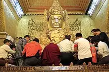 - Mandalay — Features many prominent Buddhist temples, including the impressive Shwenandaw Monastery (ရွှေနန်းတော်ကျောင်း), which was part of the royal palace before being moved to its current location and converted into a Buddhist monastery, and known for its intricate teak wood carvings. Also features the Kuthodaw Pagoda (ကုသိုလ်တော်ဘုရား), the site of the world's largest book, and the Mahamuni Temple (မဟာမုနိဘုရားကြီး), Mandalay's holiest temple and home to a gold-leaf covered Buddha statue that is the most highly-revered statue in the country.