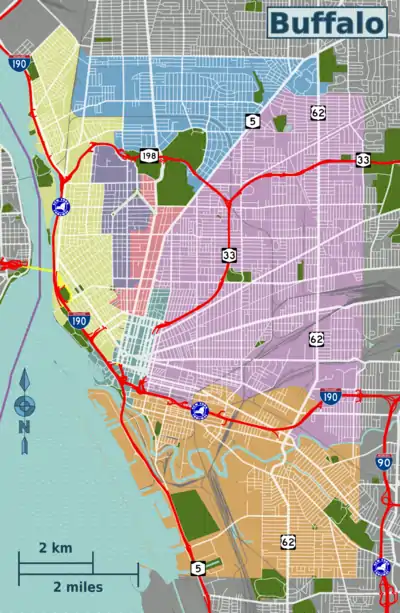 | West Side Buffalo's most up-and-coming area. Long the epicenter of Hispanic culture in Buffalo, the West Side now boasts a veritable United Nations of immigrant communities and a nascent arts scene along Grant Street, ramshackle Victorian cottages in Prospect Hill and the West Village gradually being spruced up to their former glory, and waterfront parks galore. To the north are historic Black Rock and working-class Riverside. |