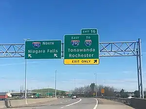 Interstate 190 begins at Exit 53 of I-90 near the city line, extending west into downtown. At that point, it turns northward and mostly parallels the Niagara River, linking Buffalo to Niagara Falls and extending onward to Canada via the Lewiston-Queenston Bridge. Interstate 290 links I-90 with I-190 via Buffalo's northern suburbs. Interstate 990 runs southwest-to-northeast through suburban Amherst between I-290 and the hamlet of Millersport, after which point Lockport is easily accessible via NY 263 (Millersport Highway) and NY 78 (Transit Road).
