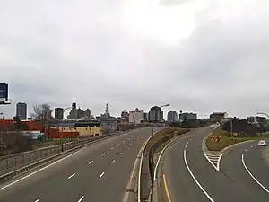 The New York State Thruway (Interstate 90) runs east to west and connects Buffalo to other major cities and regions — New York City, the Hudson Valley, Albany, Utica, Syracuse, and Rochester to the east, and Erie and Cleveland to the west. The New York State Thruway is a toll highway over most of its length, with the sole exception of the toll-free portion between Exits 50 and 55, which roughly corresponds to Buffalo's inner-ring suburbs. The New York State Thruway Authority accepts E-ZPass for toll payment, as well as cash.