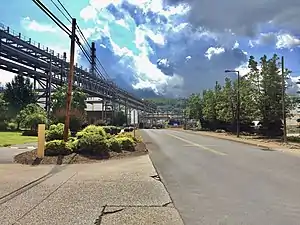 Bear right as you come off the bridge, climb up the hill, then veer sharply left once you see the onion-domed steeple of St. Mary's Orthodox Church. Continue along what's now called Holland Avenue, bearing left at the fork in front of the Family Dollar and continuing to follow the signs for southbound 19. After passing the onramps to Interstate 79, you wind and meander along 19 for another twelve and a half miles (20 km). When the road ends at a three-way junction next to the shore of the Monongahela River, you've arrived in...