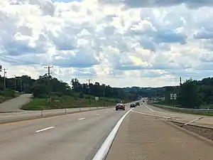 As you continue southward on 119, you'll quickly find yourself entering the suburban outskirts of the next city along the highway. About five and a quarter miles (8.3 km) past the state line, you'll come to the oddly configured intersection with Cheat Road, with signs directing you variously toward Interstate 68, State Route 857, and the southward continuation of 119. Make a sharp right, following the signs for the latter.