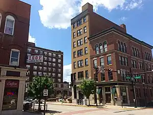 After about a mile (1.8 km), North State Street veers to the left and becomes West State Street. Then, after its intersection with Erie Street, it changes names again — to East State Street. Continue straight.