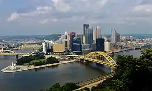 Where to head next? For starters, Pittsburgh's strange absence from the route of the auto trail to which it gave its name makes it a natural side trip for travellers along the Buffalo-Pittsburgh Highway. It wasn't too long ago that the Steel City was held up as an example of urban miasma, a place of shuttered storefronts, ramshackle slums, and gloomy desperation whose economic lifeblood had been drained by America's late 20th-century deindustrialization. But nowadays, Pittsburgh is the poster child for an altogether different phenomenon: the incipient rebound of the so-called "legacy cities" of the Rust Belt into trendy, desirable, and above all, affordable havens for folks priced out of the big coastal megacities. And it has much to offer the tourist, too: fine dining, picturesque historic architecture, big-league sports, worthwhile cultural attractions. 1920s-era travellers would have accessed Pittsburgh via the William Penn Highway or the Lincoln Highway as described above, but if you want to cheat and take the modern-day shortcut, hop on westbound Route 30 at Mount Pleasant Road in Greensburg, drive nine miles (14.7 km) into Irwin, then take the Pennsylvania Turnpike (I-76) west to the Penn Lincoln Parkway (I-376), altogether a 45- to 60-minute drive depending on traffic.