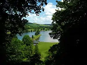 - ...or, if you prefer, make a left at that intersection and detour about four miles (6.5 km) east via State Route 857 to get to 🌍 Cheat Lake. Better known as Lake Lynn during its earliest years of existence, this 13-mile-long, 1,750-acre (21-km-long, 700-ha) reservoir along the Cheat River just south of the state line would have been a brand-new sight for auto trail-era motorists: it was in December 1925 when the first water finally flowed over Lake Lynn Dam after a decade and a half of construction, and the lake took most of the following winter and spring to fill. Unlike the Kinzua Dam which you passed by earlier, Lake Lynn Dam was conceived as a hydroelectricity project, not a flood-control measure, and to this day it provides 52 megawatts of power to the surrounding region. But the secondary recreational potential of the lake was evident from the start: in the early 1920s, even before the dam was complete, the West Penn Power Company had already built a series of cabins and cottages on what would soon become its shore, ready to be rented out as a perk for its workers. At first, Cheat Lake did indeed prove a popular destination for camping, hiking, boating, and (especially) fishing, but soon enough the dark side of the region's industrial economy reared its ugly head: the pollution dumped into the river by area coal mines, iron works, and tanneries that used to get washed downstream instead pooled in the lake, and by the 1970s it had been reduced to a foul-smelling, murky orange soup, with most of the wildlife in the surrounding woods long extirpated and only the hardiest species of fish left in the acidic waters of the lake itself. Cheat Lake has come a long way since then, though: a series of mine blowouts in the '90s finally spurred local conservationists into action, and today the water has been cleaned up enough to allow fish populations (especially yellow perch and smallmouth bass) and recreational opportunities to teem once again. If you'd like to try your luck, the Cheat Lake Anglers' Bass Club generally hosts a handful of open-to-the-public tournaments a year; check out their website for more information. And if Cheat Lake sounds like a place you'd like to linger for more than just the day, you can camp only a few minutes' drive away at 🌍 Coopers Rock State Forest (which also boasts majestic scenic views over the Cheat River canyon): primitive sites at the Rhododendron Campground go for $22/night during the high season, while the ones at McCollum Campground offer electric hookups for $10 more.