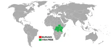 All nationalities require a visa to visit Burundi except citizens of Uganda, Rwanda, Kenya, Tanzania, and the Democratic Republic of Congo. In Europe, visas are available from the Burundi Embassy in London UK as well as embassies in Berlin, Brussels and The Hague. A 30-day tourist visa from the Burundi Embassy in London costs £60.