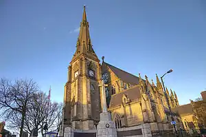 - π Church of St Mary the Virgin, The Rock, Bury BL9 0AH. Anglican parish church on a high point just north of town centre. The previous 16th C church was replaced in two stages, so the present spire dates from 1842 and the rest from 1876. Note the hammerbeam and tiebeam roof, mosaics, and stain-glass windows. It's a regimental church of the Lancashire Fusiliers, and in 2013 the military funeral of the murdered Fusilier Lee Rigby was held here.