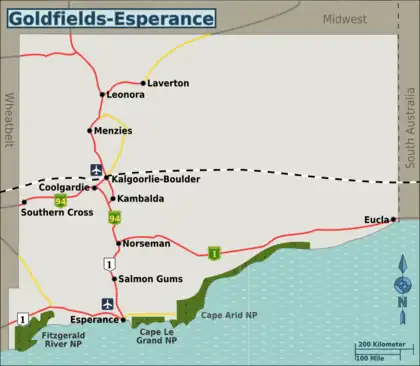 Starting in the north, the aptly named Goldfields Highway begins in Meekatharra, passing through Wiluna, Leonora, Menzies and Kalgoorlie, and joins up with the Coolgardie-Esperance Hwy outside of Kambalda. The Coolgardie-Esperance Hwy starts in Coolgardie and makes a near straight line to Esperance on the coast.