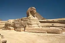 - 🌍 Great Sphinx of Giza. Like pyramids, sphinxes (ancient and modern) are found in many lands; this one is specifically the Great Sphinx of Giza. It's a single block of sandstone 45 m long by 22 m wide, bearing a man's head upon a lion's haunches. It is understood, by mainstream archeologists, to have been carved out of the bedrock in the reign of Khafre , bore his likeness, and represented a guardian spirit of the necropolis. Its original name is unknown but it was variously dubbed "Horus of the horizon" for the sun god or Abu el-Hol ("Father of Terror"). We know it by its Greek name Sphinx, which may mean "strangler" (as a lion crushes the neck of its prey, or the fate of those who failed to answer its riddles), or may simply mean "carved from living rock". Being solid, it has no inner passageways.