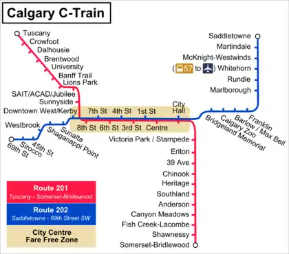 There are two LRT lines, both of which run on 7th Ave downtown: Route 201 (red on Calgary Transit maps) will be most useful to visitors, while Route 202 (blue) is more useful for locals. Route 201 runs from Tuscany Station in the northwest to Somerset/Bridlewood station in the southern suburbs, passing through the city centre and serving attractions such as the Stampede grounds. Route 202 serves mostly residents and runs from Saddletowne station in the northeast, passes through downtown, and ends at 69th St station in the southwest. LRT platforms are labelled with reference to downtown rather than by compass direction, and the trains are well signed.