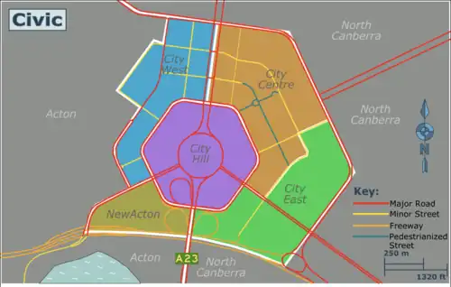 Likewise, though this part of Canberra is called "Civic", you will rarely see it on signage; instead, you'll primarily see "City" or if you're somewhere closer to Civic, signs might point out to a specific part of Civic such as City West or City Centre. Strangely, "City Centre" can either mean the entirety of Civic, or it can just refer to the northeast of the district, but in typical ACT fashion, signage is a dog's breakfast when picking one name for consistency.