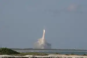 Cape Canaveral is part of a region known as the "Space Coast", since all of the manned United States spacecraft are launched from the Space Coast. The city sits at the northern end of a barrier island on the Atlantic coast of Florida, south of the geographical cape. Falcon 9 (pictured above), the first rocket to land its first stage, takes off from the Kennedy Space Center. The visitors' complex of the space center is found across a waterway, to the west.