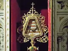 The Holy Mors or Holy Nail is known as a relic of Christ and is preserved in the Cathedral of Saint-Siffrein. This object dates from the 6th century AD. The "Saint Mors" of Constantine is a forged nail, supposedly of the Passion of Christ. This relic was kept in the treasury of the church of Hagia Sophia in Constantinople until the looting of the city by the troops of the 4th Crusade (1202-1204). It then disappeared until 1226, when it was first seen on the seal of the Bishop of Carpentras Isnard, and subsequently became the emblem of the city in 1260. The relic today on display in the Chapel of the Holy Nail in the Cathedral.