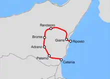 A narrow-gauge commuter railway line runs clockwise around the Mount Etna.