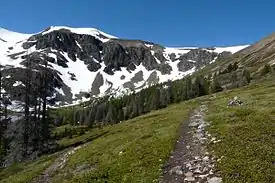 - Cathedral Rim Trail (head to Glacier Lake and then follow the signs to Cathedral Rim (or Rim)). This is the main hike that covers many of the scenic attractions of the park — Glacier Lake, Ladyslipper Lake, Stone City. It is also provides easy access for sidetrips to the Giant Cleft and the top of Quinicoe Mountain. The views are panoramic from the top, and on a clear day, you can see Mount Baker, some 130 km to the west. Allow yourself 6-8 hours to complete. The part past Glacier Lake to the top of the rim is steep and the descent to Ladyslipper Lake is long and can be hard on the knees (particularly if there is snow).