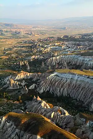 Ballooning over Cappadocia: in the foreground are the Rose and Red Valleys; the tiny village with red tile roofs in the background is Çavuşin