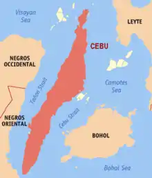 Cebu Island is a large island in the Visayas region of the Philippines. Cebu Province is that island plus several nearby small islands. The larger Negros Island lies just across the TaΓ±on Strait to the west. Leyte and Bohol are to the east.