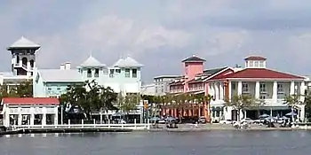 Celebration is a community in Osceola County, Florida, near Walt Disney World, designed by the Walt Disney Company to be a "perfect community". Though it was founded in 1994, the town feels a bit like something out of a TV show from the mid–20th century, with well-kept suburban houses and retro futurist architecture.