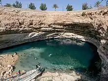 - 🌍 Bimmah Sinkhole (Hawiyat Najm Park: 'Meteor Fall Park') (6 km south of Dibab/Dabab, off of the road from Qurayat to Sur). A deep sinkhole about 0.5 km inland from the coast, filled with blue-green brackish water. The locals say that a meteor fell on this spot of land, resulting in the natural depression and forming a small lake. The sinkhole is within in a walled park, with picnic and toilet facilities. Swimming is permitted. The sinkhole is connected to several cave networks, as yet not fully explored. Free.
