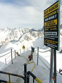 - 🌍 Vallée Blanche cable car (Télécabine Panoramic Mont-Blanc, Funivia dei Ghiacciai). Starting from Aiguille du Midi at 3778 m, the first section runs to Gros Rognon at 3536 m. This is just a technical station where the cable takes a corner, and you can't get out. The second section is near-level over the Glacier du Géant, to Punta Helbronner at 3466 m on the border with Italy. This is the cable car that stranded 110 people, some overnight, in Sep 2016; it's also the one that a French military jet tried to fly beneath in 1961, and took out three cars. Return from Chamonix adult €92, child & senior €78.