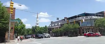 - π The Spotted Dog, 111 E Main St, Carrboro (corner of East Main and Weaver Street, across from Weaver Street Market), β +1 919-933-1117. SuβTh 11:30AMβ10:45PM, F Sa 11:30AMβmidnight. Eclectic menu: a mix of North Carolina classics, international cuisine, trendy dishes, and creative concoctions. Extensive drink menu including eighteen North Carolina beers and ciders. The focus is on vegetarian food, though there's plenty of meat on the menu as well. The staff is very comfortable with dietary restrictions, and the menu includes lots of quality vegan and gluten-free dishes. Children's menu for 12 and under. $12β20.
