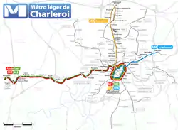 Métro léger de Charleroi, which translates as "light metro of Charleroi", is a light rail system that is a combination of underground rail and street-level tram/light rail, which is often referred to as a "pre-metro". In the city centre, it travels underground over a loop line, while going into the suburbs it becomes a ground-level light rail with separate right-of-ways or a street-level tram using the tracks of Belgium's former vicinal system.