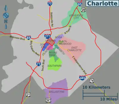 | Myers Park Once altogether outside the city, Myers Park is near the heart of modern-day Charlotte. Its reputation as an "old money" neighborhood is accentuated by its beautiful tree-lined and winding avenues. Home to some of Charlotte's oldest and most expensive homes as well as Queens University of Charlotte and Freedom Park. A driving tour of Myers Park is a popular way for tourists to get acquainted with the neighborhood. |